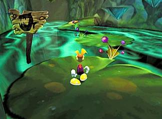 | NIVEL3 Salta a la raíz del árbol y atrapa el Lum que hay a escasa distancia; vuelve al principio y usa las lianas poro llegar hasta lo jaula que flota sobre el agua, liberando así a Ssssam. Si te fijas, verás que todos los lums están repartidos a,lo largo del camino, así que síguelo evitando los obstoculos. Están en grupos de cinco, el primero de ellos en el túnel y el otro al final del mástil del barco pirata.