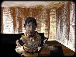 Mira hacia arriba desde el agua y «lee» al hombre que está de pie sobre la orilla para cruzar el agua. Gira a la izquierda de su amigo y «léelo». Cliquea sobre él. Date la vuelta sobre el puente y aproxímate al hombre calvo. «Lee» al hombre calvo. Gira a la derecha y cliquea sobre la señora con la máscara púrpura. Gira y aproxímate a la señora con el vestido dorado junto a la estatua. «Lee» a la mujer. Márchate y mira dentro del agua. Date la vuelta y «lee» a la señora del vestido dorado. Date la vuelta más adelante sobre el puente y cliquea sobre la señora con la máscara púrpura y nuevo. Regresa y ponte de pie junto a tu amigo y apunta al hombre de enfrente en la orilla. Gírate y ponte frente a tu amigo. Ve hacia la mujer con el vestido dorado. Luego ve hacia la calle- Gira a la derecha. Ve hacia adelante y gira a la izquierda. Mira al mendigo. Gira a la derecha y encuéntrate con M. Márchate. Date la vuelta. Apártate. Date la vuelta. Cliquea sobre él. (después de una pantalla negra, deberías estar en la bóveda). Gírate hacia M. Date la vuelta y coge una linterna. Empieza a caminar. «Lee» los esqueletos. Coge las escaleras a la derecha.