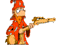 ÚLTIMOS PASOS En la plaza del pueblo encontré al pobre burro atado en la picota como un criminal, y esta vez pude cortarle un trozo de cola con ayuda de las tijeras y fabricarme con ella un bigote. Pregunté a los guardias acerca de la espada que tenía en mi poder y me explicaron que los enanos que trabajaban en la mina podrían ayudarme a arreglarla. Salí de Ankh-Morpork, me dirigí al lugar de las montañas donde se encontraba la entrada del templo de Offler y conseguí librarme del monje que custodiaba la puerta con ayuda de la alfombra. Dentro, encontré una venda para los ojos en un colgador y una gran cantidad de trampas mortales que impedían el acceso a un altar. Encontré dos enanos trabajando en la mina, y uno de ellos, el herrero, me dijo que arreglaría la espada a cambio de un vaso de vino de bayas. Una vez en la taberna, el camarero me explicó que no le quedaba vino y que tendría que ir a buscarlo a la bodega, pero la bodega estaba llena de ratas y le daba demasiado miedo entrar. Así que me dirigí a la posada, encontré una extraña criatura detrás de la puerta de la habitación, saqué las bisagras de la puerta con ayuda del destornillador y le convencí para que acabara con las ratas de la taberna. De regreso al «Tambor roto» encontré el camino a la bodega libre y llené la jarra con vino de bayas de uno de los barriles. Guardé la jarra de vino en mi propio inventario para evitar que mi equipaje se la bebiera, volví a la mina y, a cambio de la jarra de vino, el enano se ofreció a arreglar la espada. Alimenté de nuevo a M16 con los carbones que ardían en el horno de la mina, repetí el proceso con el fuego de las mazmorras del palacio y, finalmente, le dí de comer un petardo. Con el estómago de M16 cargado a la máxima potencia, y con parte de los requisitos necesarios para convertirme en un héroe, me dirigí a la plaza de la ciudad y allí se desarrolló un terrible combate entre M16 y el gigantesco dragón. Pero entre el fragor de la batalla decidí lanzar al dragón la tarta de natillas y, ante el asombro de todos los presentes, el dragón resultó ser una hembra en celo que se enamoró perdidamente del pequeño M16. Los enamorados levantaron el vuelo y abandonaron el lugar, devolviendo la paz a Mundodisco.