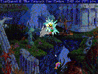 Me encontraba muy embebido en este trabajo, cuando, para mi sorpresa, el delfín me habló. Pasados los primeros momentos de desconcierto, mi nuevo amigo me pidió que le ayudase a salir de una red que le aprisionaba para poder terminar la misión que estaba realizando. Así lo hice y él se alejó mar adentro. Por suerte, una semana después, Delphineus regresó. Estaba preocupado por la desaparición de Cetus, su rey. Este suceso había provocado diversos problemas en su ciudad, por lo que aceptó de buen grado mi oferta de ayuda. Comenzaba la aventura. Naturalmente, necesitaba un equipo de inmersión, y yo sabía que había uno en el armario que estaba debajo de la pizarra. Después de recogerlo, nos pusimos en marcha. Desgraciadamente, un enorme barco que estaba tirando un montón de basura nos impedía continuar. No me quedó más remedio que recoger toda la que pude en mi bolsa para abrir un camino y poder así pasar a través de ella. Entre tanta porquería, encontré un bote de cristal que guardé cuidadosamente para futuros usos. Estos desechos afectaron al sentido de la orientación de mi amigo Delphineus, por lo que me pidió que le guiase durante un tiempo. Me puse el equipo de inmersión y comencé a sumergirme hasta que me encontré ante algo que me impresionó. Delante de mí, aparecía una maravillosa ciudad que en su tiempo debió ser bellísima. Sin embargo, ahora, yacía semienterrada en basura. Entre tanta suciedad, una cesta metálica llamó mi atención. La guardé y seguí limpiando la zona. No se veía a nadie, así que curioseé por el templo. Allí descubrí una concha de bronce que, ansiosamente guardé junto a mis otras pertenencias. Salí del templo y me detuve ante una estatua de Poseidón, dios de los mares. Al observarla, me di cuenta de que le faltaba algo y probé a colocarle la concha que tenía en mi poder. La estatua, agradecida, me concedió el tridente que sujetaba. Con éste en mi poder me dirigí a la sala del senado. Este cuarto estaba decorado con misteriosas pinturas (descoloridas a causa del agua y del paso del tiempo), que cubrían todas las paredes. En uno de estos tapices se podía observar un dibujo de tres ojos juntos. Una idea me cruzó por la cabeza y probé a pincharlos con el cetro de Neptuno. Con un ruido ensordecedor, una trampilla de la pared se movió dejando a la vista un pez que exhibía un ojo sobre el lomo. «Yo soy el oráculo. ¿Quién me llama?». Le respondí que me llamaba Adam y que había venido con Delphineus para ayudar a la ciudad. «Tres acertijos debes resolver si quieres ser realmente útil». Al primero contesté «el Hombre», al segundo «el Pez» y al tercero «el Amor». Satisfecho con las respuestas, el oráculo me pidió «una prueba de confianza» para demostrar que yo correspondía con el protagonista de la leyenda de Eluria. Como comprenderéis, ya no me podía echar atrás, así que me dirigí primero al senado y después hacia una estatua con forma de ballena situada a la izquierda de éste. Apenado por el aspecto que tenía la estatua de coral, me puse a regarla con la solución fertilizante de mi padre, esperando que funcionase igual que en el laboratorio. Hubo suerte y el petróleo adherido a la estatua se desprendió. Allí conocí a Demeter, «guardián de los verdes» encargado de cuidar los jardines de la ciudad. Me regaló una poción curativa, confiando en que me fuese más útil de lo que había sido para él, en su tarea de proteger a los habitantes de la ciudad del ataque de los desperdicios de los humanos.