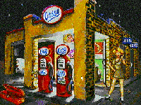 Cada vez era más importante encontrar a Lydia, así que puse rumbo a la casa del profesor Sandler. Allí sólo encontré a Jimmy, el hermano pequeño. El chico siempre había sido un empollón de tomo y lomo, y no despegaba la nariz de los libros ni para echar un partido de béisbol. Al contarle la historia, me dijo que también él había tenido un encuentro con el ser. A él tampoco le había parecido peligroso, sino que había detectado que el pobre andaba bastante mal. Su cuerpo presentaba zonas heridas por el accidente, y se intuía una debilidad enorme, seguramente motivada por la falta de alimento adecuado. Según Jimmy, se trataba de una forma de vida basada en el Germanio, y según había leído, un ser de esas características sólo podía alimentarse con isótopos radiactivos. En cuanto a sus heridas, únicamente se curarían con la aplicación de un emplasto de goma licuada con sulfídrico. Los isótopos sólo podían ser hallados en la base militar. En cuanto al alimento, haría falta un recipiente, algo de goma, un agente licuador como un alcohol producto de la destilación y, por supuesto, el sulfídrico. Para recoger más datos con base científica, me acerqué al observatorio para pedir su opinión al profesor Sandler. Estaba de acuerdo en que se trataba de una forma de vida basada en el Germanio, y que se encontraba herido y hambriento, pero no tenía ni idea de cómo ayudarlo. (¡vaya con el joven Jimmy!). Antes de irme, aprendí a usar el telescopio, y pude observar dos nuevos planetas que el profesor había localizado. En uno de ellos, parecían divertirse de lo lindo, seres de aspecto similar al nuestro, y de costumbres bastante agradables, por lo que podía verse. Comprendí que debía encontrar a Lydia cuanto antes, y como se acercaba la hora de nuestra cita, me acerqué al restaurante. Aún no había llegado, pero tomé prestado un recipiente para preparar los combinados especiales de Jimmy si llegaba el caso. En casa del doctor recogí unos productos útiles para el mismo fin y recordé que si quería obtener el alimento para el pobre alien, tendría que entrar en la base, lo que no era una tarea fácil. Para darme ánimos, pasé por el bar para tomar unas copas y me llevé una botella de repuesto por si más tarde me era útil.