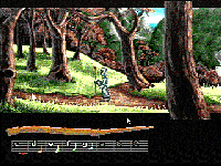 El camino estaba cortado, y me puse a pensar que el pequeño trozo desprendido no podía ser obstáculo para alguien como yo, que acababa de vencer a un enorme dragón. Con paciencia, repasé mis conjuros, y tengo que confesar que cuando di con el adecuado hasta yo mismo me quedé boquiabierto con lo que mis ojos contemplaron. Seguí mi ruta y llegué a un cementerio, donde un joven perteneciente al gremio de los herreros dormitaba plácidamente. Desde allí, contemplé la monstruosa ciudad de este nuevo gremio, con la forma de un enorme yunque. A las puertas de esta gran urbe, comprobé que de nada servía mi hechizo para abrir puertas, pues los guardianes no dejaban pasar absolutamente a nadie que no fuese de la ciudad. Recordé que el joven dormido tenía ropas usadas por el gremio, y que si me las ponía quizá podría engañarles y pasar el control sin mayores problemas. Luego, me di cuenta que de nada me serviría si una vez dentro cualquiera podía reconocerme como intruso. Cuando ya comenzaba a desesperarme, a mi memoria acudió una musiquilla aprendida en cierto lago mientras mi imagen se reflejaba. La cosa funcionó tan estupendamente que, incluso el maestro herrero, me confundió con el joven aprendiz Rusty, y me aplicó el castigo que a éste tenía reservado. Fui despojado de mi bastón mágico, encerrado en un calabozo y tuve, además, que contemplar cómo el viejo herrero lanzaba mi bastón al fuego,como si de un vulgar trozo de madera se tratase. Mi desesperación acabó en sueño, al final del cual algo extraordinario había sucedido. Mi bastón había vuelto. Salí del calabozo y me adentré en los sótanos de la fortaleza. Allí me llevé la sorpresa de descubrir nuevamente a Mandible, en animada conversación con uno de los Maestros del Gremio de los Herreros. El malvado obispo tenía encargada la elaboración de espadas para abastecer a un enorme ejército, y su pedido estaba ya casi terminado. Decidí intervenir boicoteando el trabajo, pero fui sorprendido y apresado por la guardia del Clérigo. Me condujeron hacia el castillo de los Clérigos, donde fui encerrado en una jaula como un animal, y estrechamente vigilado por el obispo y su más fiel esbirro. Esperaron a que hiciese uso de uno de mis hechizos, y fue el instante en que me fue arrebatado nuevamente en bastón mágico. Era lo que el malvado había estado esperando. Sus planes eran abrir una puerta entre este mundo y el más allá. Un ejército de muertos pasaría a nuestro mundo y él sería su jefe absoluto. Alimentados con el ganado de los pastores, armados con las espadas forjadas por los herreros y guiados por la visión del futuro extraída de la bola de cristal mágico, serían algo invencible.