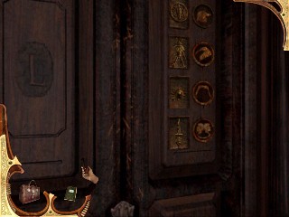 El Enigma de los Sellos Pon los cuatro sellos requeridos de tu inventario como siguen (se supone que anotaste antes las descripciones de los dioses en la vitrina): Arriba 1- Sebek, señor de las aguas. Cabeza de cocodrilo de perfil. 2 – Thot, Patrón de los escribas, hombre con cabeza de ibis (el pájaro de perfil, con el pico largo) 3 – Nout, la bóveda celeste. 4 – Bes, Varias cabezas que blanden cuchillos. Abre esa puerta. Entramos en el estudio del Señor Montcalfe.