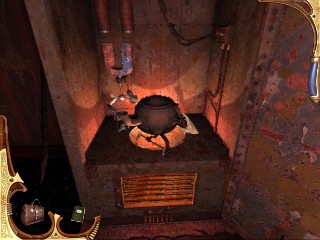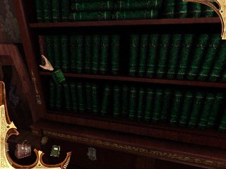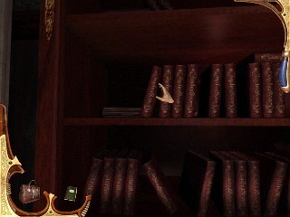 ¡Graba la partida! No toques la barandilla. Da la vuelta hasta el final opuesto de la galería y en el último estante, te das la vuelta para ver un libro azul. Haz clic en él. Una escena revela un cuarto secreto tras la estantería. En el hay una máquina Faraday anticuada que está produciendo la electricidad en las barandillas. Recoge la PALA de la izquierda. Usa la pala para retirar el carbón de la máquina. Entonces tira de la palanca que hay en el lado derecho de esa especie de olla. La máquina ha sido desactivada, y ya no hay electricidad en las barandillas. Sal a la barandilla y avanza hasta la primera puerta.. Mira hacia abajo y recoge el rifle viejo. Examínalo para encontrar unas huellas en el rifle, al parecer la momia tiene «piel en sus dedos». Esta momia no está lo bastante muerta después de todo. Baja los escalones espirales y recoge la escalera de mano que está apoyada en la escalera de caracol. Vete al estante con libros rojos en la esquina opuesta de la biblioteca. Pon la escalera de mano apoyada en la barra contra los estantes y sube y haz clic en los libros rojos. Al apartarse descubrirás un lugar secreto para encontrar un recibo de materiales explosivos y la guía de usuario de la dinamita. Y, a la derecha un EMBUDO que permite el gota a gota. Deja el cuarto por las puertas dobles y entras en el primer estudio que estuviste. Toma la VELA del escritorio a la derecha.