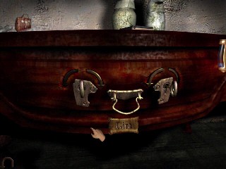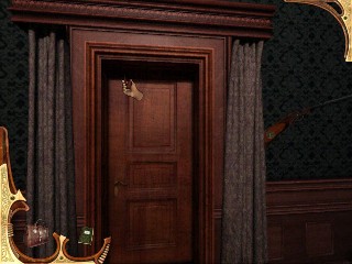 Gira a la derecha y entra por la puerta con cortinas verdes que hay delante de ti. Estarás de frente a una puerta doble de madera. Dobla a la izquierda y camina a la esquina para examinar el sarcófago. Está vacío, por los comentarios de Sherlock, Momphis XI parece haber ido a dar un paseo. Mira la arena. Sal del sarcófago y verás un rifle en la pared, a su izquierda una cortina. Ve adelante, dobla a la derecha y haz clic en la parte de arriba de la cortina para revelar otra puerta. Continuemos nuestro examen de este cuarto, no obstante. Primero Mira hacia abajo delante del sofá y recoge la nota de Elizabeth. Dobla a la izquierda y camina hacia la chimenea. Examina la cabeza del león. Un trofeo de caza. Continúa la izquierda y mira el armario grande de la esquina. Aún no podemos abrirlo. Vuélvete a la izquierda. Camina al armario y mira hacia abajo en la oscuridad del armario abierto para recoger una ESCOBILLA PARA PIPAS. Haz clic en cualquiera de las pipas para oír que a Sherlock y al Señor Montcalfe les une su pasión por las pipas. Busca arriba y haz clic en el cuadro del Señor Montcafe. Es extraño que ninguno de sus hallazgos arqueológicos pueda verse abajo en el museo. Cuando sales de la vista del cuadro, mira en la pared un gráfico del árbol familiar, el Señor Montcalfe ha añadido algunos comentarios. Toma nota particularmente de los comentarios de Sherlock sobre Jonathan Parkey («ladrón, descuidado.)» Gira hacia la puerta de la entrada. Mira los cuadros de la pared al lado de la puerta, de Montcalfe en Egipto. Deja la habitación. Dobla a la derecha en el pasillo, ve adelante una vez. Dobla a la derecha y entra.