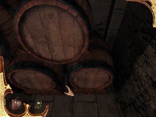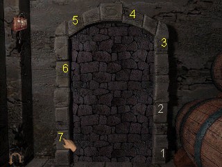 Ve adelante una vez. Date la vuelta y busca un tapón en el barril inclinado. Haz clic en él. Algo de pólvora empezará a caer del suelo. Entra en el inventario y pulsa sobre la bolsa de Parkey (y encuentra una nota) tras leerla, usa la bolsa para recoger algo de POLVORA del suelo. Date la vuelta y ve a la izquierda, delante de un montón de cascos de botellas rotos en el suelo. Recoge una BOTELLA ROTA. Sherlock puede necesitar golpear a alguien, o algo similar con ella. Vuélvete a la derecha y toma la LAMPARA de encima de la mesa. Dobla a la derecha y verás que aparece la mano con un dedo apuntando ahora a la puerta tapada con piedras. Mira hacia abajo a la derecha y recoge un pincel, en el juego lo llaman CEPILLO de PINTURA de entre los barriles de la derecha. Coge el cepillo dl inventario. Haz clic en la puerta. Usa el cepillo en la piedra del centro del arco que hay encima de la puerta para revelar el número «3». Ahora debes hacer clic cada tres piedras para abrir la puerta. ¿Ah, pero por dónde empezamos a contar? Éste es uno de los dos enigmas más duros del juego. Pero, siempre hay una solución: El Enigma de la Puerta de Piedra, Solución: Aprieta la primera piedra de abajo a la derecha. Cuenta 1, 2, 3 y haz clic en la siguiente piedra. Continua así contando tres baldosas y haciendo clic en la piedra correspondiente, de tal forma que la última que debes apretar es la segunda baldosa de la izquierda. Cuando hayas apretado la última haz clic en la puerta de piedra y podrás pasar a la siguiente sala.
