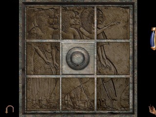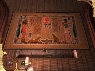 Date la vuelta y usa la llave en las puertas cerradas detrás de ti. Entra en la habitación. Ve a la izquierda y recoge a un segundo SELLO detrás de la estatua cercana a la puerta del fondo. Date la vuelta y acércate a la momia, en el cento del cuarto. Mira hacia abajo. Abre la caja de las herramientas y extrae las herramientas. Debes recoger un FRASCO de ACEITE, un MARTILLO CON PALANCA, y un DESTORNILLADOR. Mira ahora arriba, para examinar la momia de Khaepaseth. Mira la inscripción de la pared que muestra la maldición de la momia. Date la vuelta y examina el mueble de cristal. Los documentos son» ilegibles». Ves los trozos y papeles tirados por todas partes. Parece que alguien ha saqueado el lugar. Ve a la puerta al final del cuarto a la derecha según habíamos entrado al principio. Dobla a la derecha antes de salir y debajo de una silla recoge UN ALFILER DE CORBATA. Sal por la puerta cercana y entra en la siguiente habitación. Ve adelante, hacia la escultura de Anubis. Pasa por el lado izquierdo y en el suelo entre un aparador y una estatua, en el suelo verás el tercer SELLO a la izquierda. Gira ligeramente a la izquierda y examina el cuchillo de sacrificios en el más bajo estante del armario. (Acuérdate de donde está como referencia para más tarde.) Examina ahora la estatua negra grande de Amenophis. Ve adelante hasta el final de la habitación. Hay una puerta doble a tu izquierda y otra delante de ti. Examina los cuadros que hay entre las dos puertas y recoge la FOTOGRAFÍA DE ELISABETH MONTCALFE (es la que está bajo la foto de la esfinge). Haz clic en el cuadro. Haz clic en la foto agrandándola. (Se añadirá a tus cartas en el inventario como el testamento o muchos otros documentos que irás encontrando. Las flechas te permiten navegar a través de los documentos que recoges. Examina a menudo tus documentos para refrescarte la memoria y encontrar pistas que te permitirán avanzar en la historia. Una de la cartas te avisa de que la mansión está «llena de trampas!» Mira hacia abajo en el suelo delante de la puerta a la derecha y delante de ti. Recoge el TROZO DE VENDA. Cruza el cuarto y examina la momia que está en la urna de cristal en el lado opuesto de la habitación. Vuelve a las puertas dobles en la parte de atrás y al lado de los cuadros y comprueba los símbolos. Parece claro que necesitarás cuatro SELLOS de los que hemos encontrad paa abrir la puerta. La otra puerta está cerrada y tienes que encontrar la llave todavía. Así que, vuelve a través de este cuarto y sal a través de la puerta. Atraviesa toda la habitación. Abre la puerta del final para llegar a otra sala. Ve a la izquierda para examinar un extracto del «Libro de los Muertos» en la vitrina. Examina los canopes en el estante de la derecha. Ve hacia adelante y gira a la izquierda para examinar una vitrina con imágenes de varios dioses y diosas. Toma nota cuidadosamente de las estatuas pequeñas y sus descripciones. La puerta al final del cuarto también está cerrada con llave. A la derecha de esa puerta hay una piedra con un jeroglífico y justo a su derecha puedes recoger el cuarto SELLO en el suelo. La puerta lateral también está cerrada. Gira a la derecha. Verás cuatro estatuas, haz clic en la segunda estatua de la izquierda. La estatua se moverá a un lado, revelando un compartimiento cerrado con llave. Pero puedes forzarla. Usa tu destornillador para romper la cerradura. Abre el compartimiento y extrae una LLAVE. Perderás el destornillador, como te sucederá con otros objetos cuando ya no los necesites. Regresa a la izquierda y usa tu frasco de aceite en la puerta. Entonces usa la llave de color plata que encontraste bajo la estatua. Las puertas se abren. Parece que este cuarto nunca se ha usado como museo. Quizá se usara como almacén y para desempaquetar las piezas que llegaban al museo. Avanza y echa una mirada en el espejo grande. Aparecerá una momia, aunque parece que por ahora no tenemos que temer. Ve a la derecha y echa una mirada en esas cajas del suelo. Usa tu martillo del inventario para abrir la caja y recoger una RUEDA DENTADA GRANDE, una MEDIANA, y una PEQUEÑA. Vuelve a hacer clic de nuevo en la caja para agregar alguna MADERA a tu inventario. Sigue pasado las cajas al final de la habitación. Mira el armario grande del fondo. Usa el alfiler de corbata de tu inventario para abrir la puerta. Recoge la BOTELLA DE WHISKY. Deja la habitación y regresa al la habitación donde estaban los símbolos de los cuatro sellos.