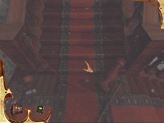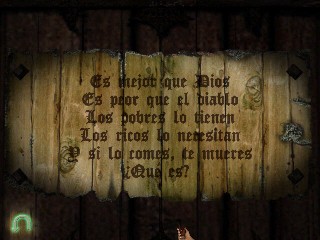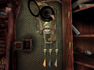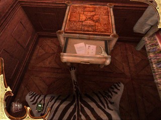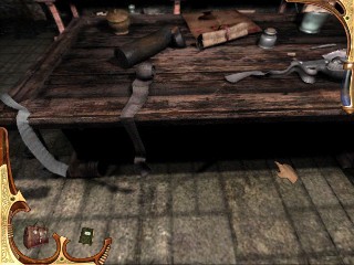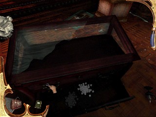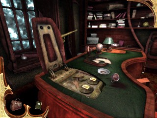 Vuélvete inmediatamente a la izquierda, mira hacia abajo y recoge el Inventario de la colección del suelo, cerca del libro caído. Míralo para ver que puede haber habido alguna manipulación ilegal del inventario arqueológico que Montcalfe coleccionó. Justo encima, en la pared hay una caja que no puedes abrir por ahora. Continúa a la derecha al cuadro encima de la chimenea. Verás una ranura, pero ninguna acción está todavía disponible con tu inventario. Examina el fuego de la chimenea. Es extraño. ¿Un fuego, recientemente hecho en una mansión abandonada? Continúa alrededor del cuarto y haz clic en la ventana para ver una escena misteriosa. Alguien merode por la casa. Examinan el anteojo. Date la vuelta al escritorio, recoge y lee la carta de dimisión de Edward, el mayordomo. Camina al estante de la pared al lado del escritorio y verás el otro lado de la puerta pequeña no podías abrir desde la biblioteca. (No hagas clic en ella a menos que quieras volver a entrar en la biblioteca.) Ahora mira, junto a la puerta, una pizarra vacía, han borrado todo. Quizás alguna fórmula que Montcalfe deseó guardar en secreto. O quizá el que hemos visto en el tejado tiene algo que ver con esto. Claramente, alguien ha estado en el estudio recientemente. Deja el cuarto y vuelve a la primera habitación donde encontraste la escobilla para pipas. Ve a la puerta que estaba tras las cortinas y usa EL REGISTRO FALSO bajo la puerta.