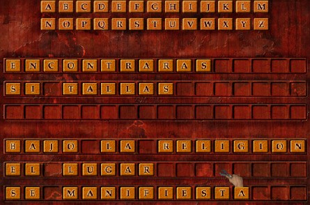Primera Línea: ENCONTRARAS Segunda Línea: SI TALLAS Tercera Línea: (déjala en blanco) Cuarta Línea: BAJO LA RELIGION Quinta Línea: EL LUGAR Sexta Línea: SE MANIFIESTA