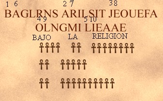 Hay una serie de símbolos ankh que indican el número de letras que formarán cada palabra. Para descifrar el mensaje, lo que debemos hacer es ir cogiendo la primera letra de cada palabra de arriba, luego la segunda de cada palabra y así sucesivamente e ir poniéndolas en los símbolos para ir formando la nueva frase. Así conseguiremos lo siguiente: