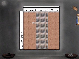 EL BAÑO Deja el cuarto y avanza por el vestíbulo para entrar en la puerta más lejana a la derecha. El baño. Recoge la Pastilla de JABÓN del lavabo. Antes de que salgas, comprueba la bañera. Hmmm, el agua todavía está tibia. ¿Quién se habrá bañado? ¿Y, quién sería lo bastante tonto para dejar el agua en la bañera? A menos que, claro, interrumpiste algo y llenaran la bañera para borrar la evidencia. Tira del tapón y vacía la bañera. Haz clic en el fondo de la bañera…. hay un residuo de arena. Deja el cuarto y regresa a la puerta que estaba tras la cortina y usa la pastilla de jabón en la cerradura, vuelve a poner el registro falso bajo la puerta (si no está todavía allí). Usa la escobilla para pipas en la cerradura. Voila! Una escena revela el truco para conseguir otra LLAVE. Usa la llave para abrir la puerta y entrar en la alcoba de Montcalfe. Hay temas decorativos egipcios por todas partes.
