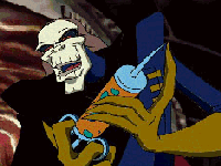 28.Ordena a Lady Infotunata que use el escaner. 29.Entra en la sala de mandos (olvidate de la gata), en el panel derecho pon los cuatro cristales si los colocas en el lugar correcto se encienden. Empuja la palanca y coge el dispositivo. Dirígete al monitor y mueve los 4 interruptores de las esquinas hasta conseguir esta combinación: on, abierta, abierta, desactivado. Entra y coge el malificador, no te pierdas el final. Un saludo, Andres Truido.