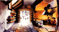 Volver por donde hemos venido y entrar por la derecha (establo: herrería). Hablar con herrero: 3/3/3/2/2/3/2/2. Coger tenazas. Coger herradura (en el arco de la puerta). Salir y todo a la izda. hasta la plaza. Entrar en la puerta de la izda. (sastrería): coger aguja, usar biombo y usar vestido. Hablar con sastre: 2/2/2/4/3/1. (SAVE 1) Salir (le devolvemos el traje) y entrar en casa central (la de la bandera), que es el cuartel general de los mosqueteros. Practicar en el muñeco. Entrar por puerta central, llamando antes, o seremos unos malos educados. Hablar con el jefe y examinarlo todo, cogiendo un melón. Salir y volver a entrar llamando. Examinar papeles y pila de papeles en toda la mesa: cogemos uno que usamos en la vela. Hablarle: nos da un pase. Examinar y leer pila de papeles de debajo de la mesa: cogemos uno («Cooking Roster»). Salir y salir a la ciudad.